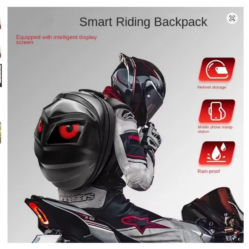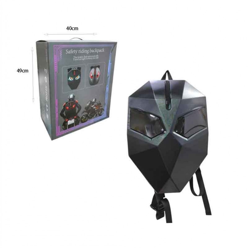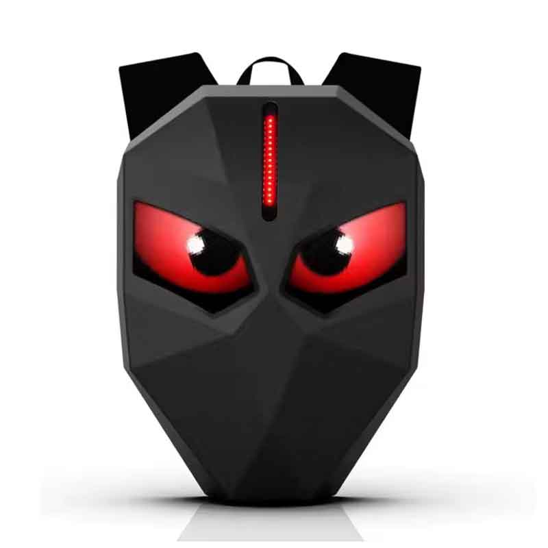 Εντυπωσιακό σακίδιο πλάτης για μοτοσυκλέτα με LED φωτισμό τύπου “μάτια”, σκληρό εξωτερικό περίβλημα και δυναμικό design για υψηλή ορατότητα και μοναδικό στιλ στον δρόμο.